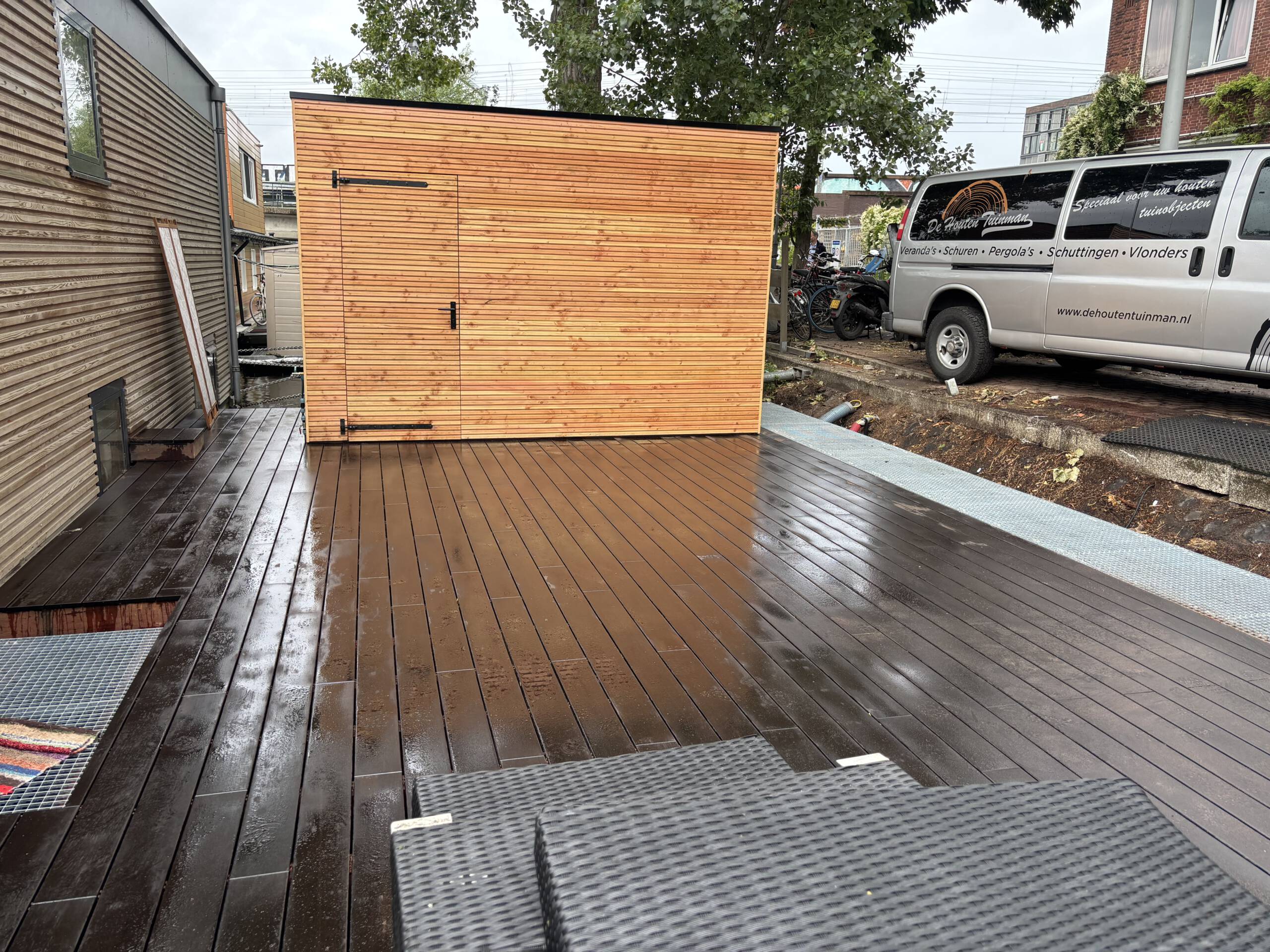 In Hilversum hebben wij een stijlvolle berging gerealiseerd die perfect geschikt is voor het opbergen van fietsen, gereedschap en speelgoed. De buitenzijde is afgewerkt met een modern douglas rhombusprofiel, wat zorgt voor een unieke en hoogwaardige uitstraling. Ook hebben we de elektra verzorgd, waardoor de berging is voorzien van verlichting en een praktisch stroompunt.