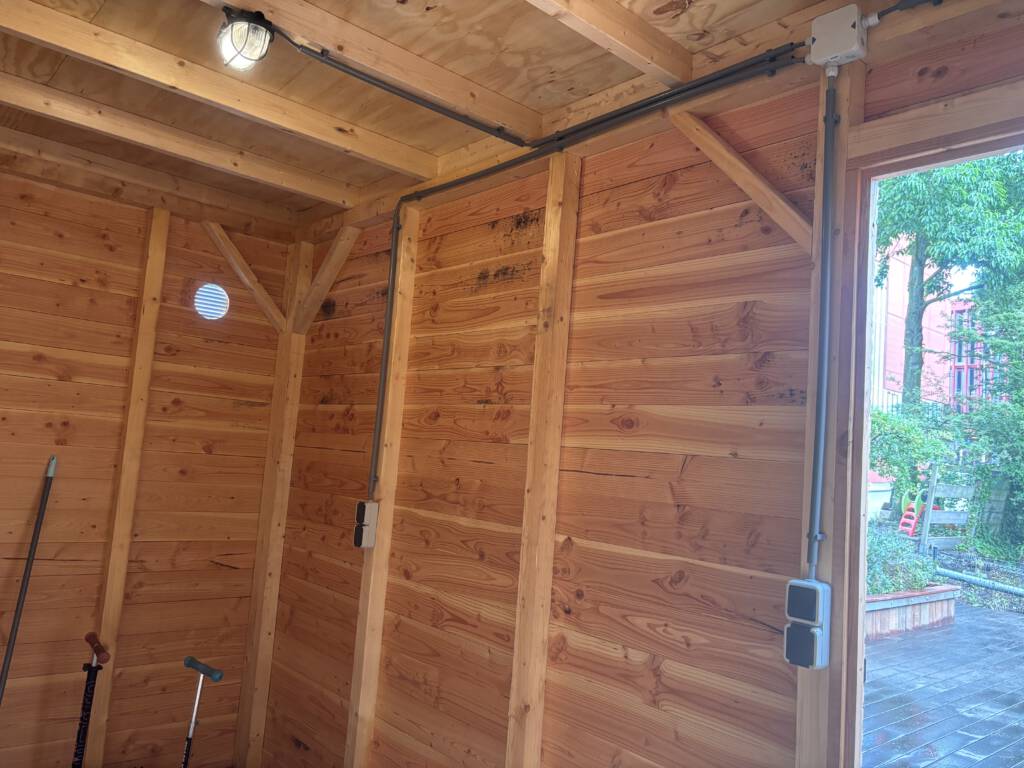 Voor dit project hebben wij de volledige berging gebouwd, inclusief afwerking, elektra en materiaalkeuze. Door het gebruik van douglas rhombusprofiel en een nette elektrische installatie is de berging onderhoudsarm, modern en direct bruikbaar.