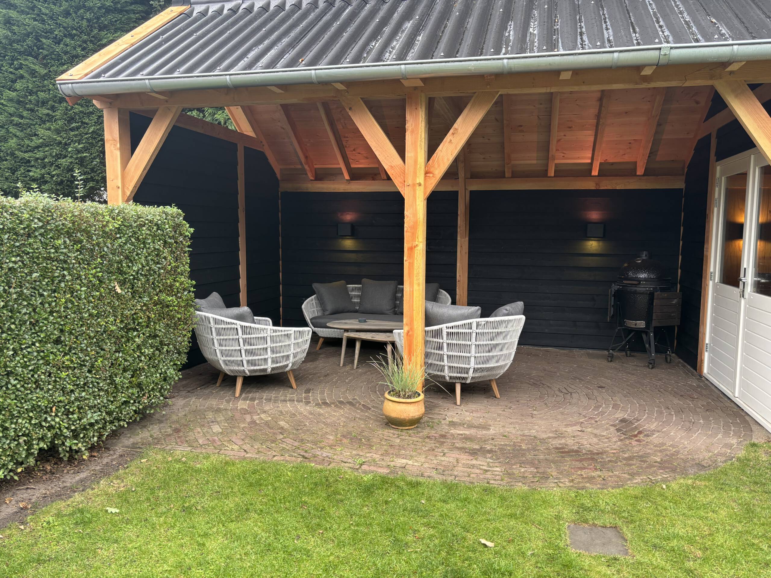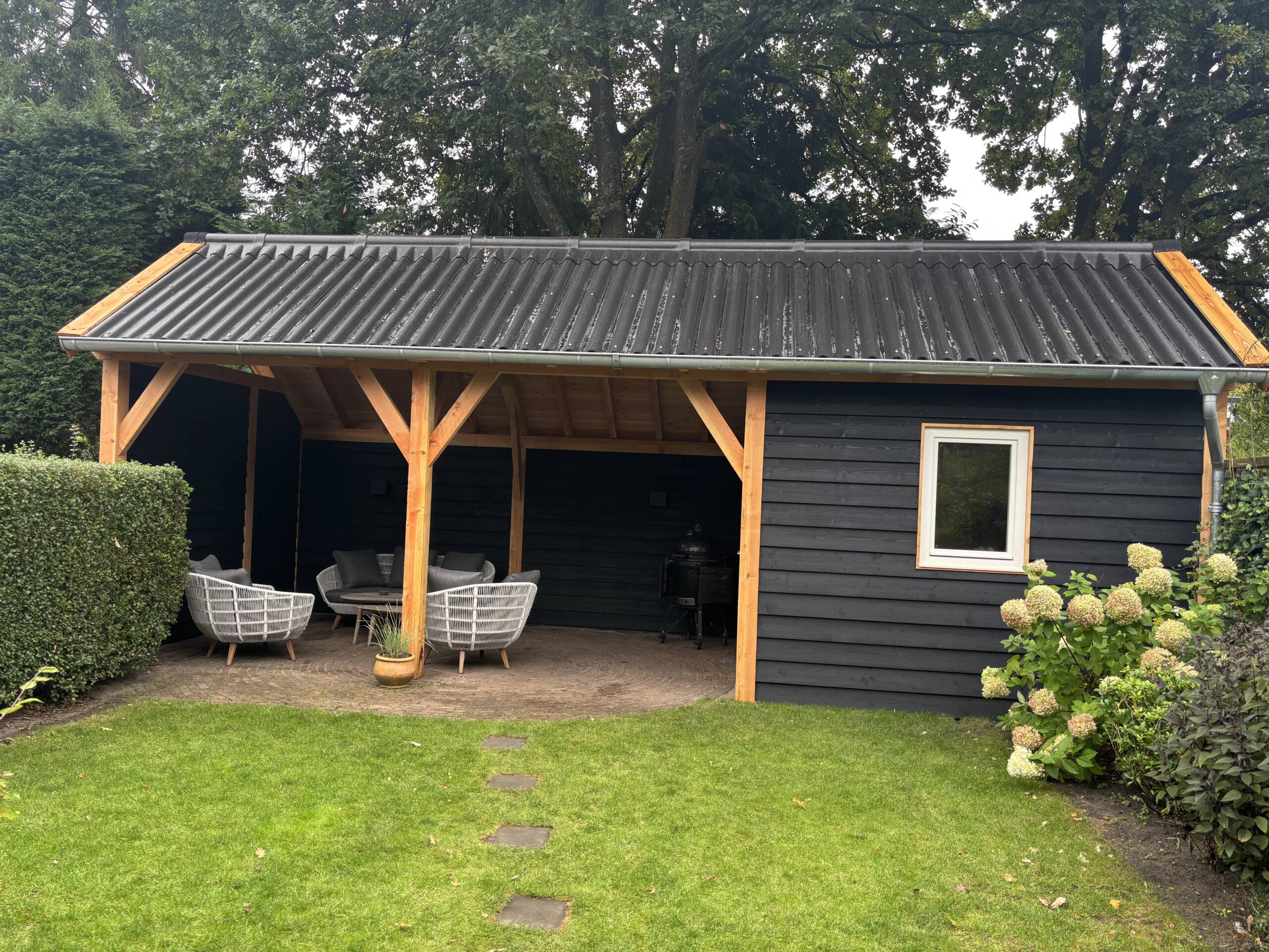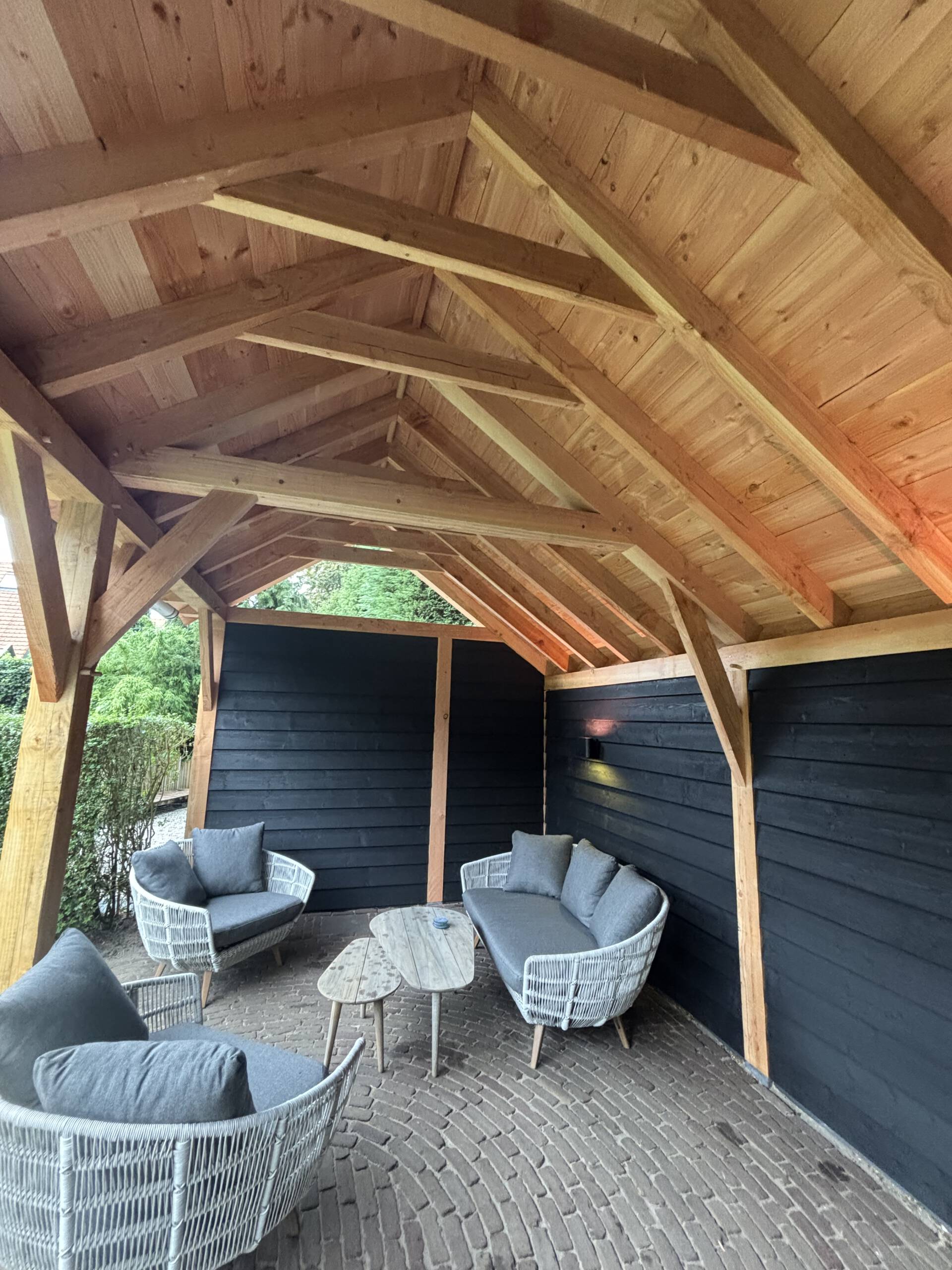 In Soest hebben wij een prachtige kapschuur met een volledig geïsoleerde berging gerealiseerd. Een ideale plek om tot laat buiten te zitten, beschut tegen regen, wind en vallende bladeren. Dankzij de combinatie van een open zithoek en een afgesloten berging is deze kapschuur het hele jaar door praktisch én sfeervol.